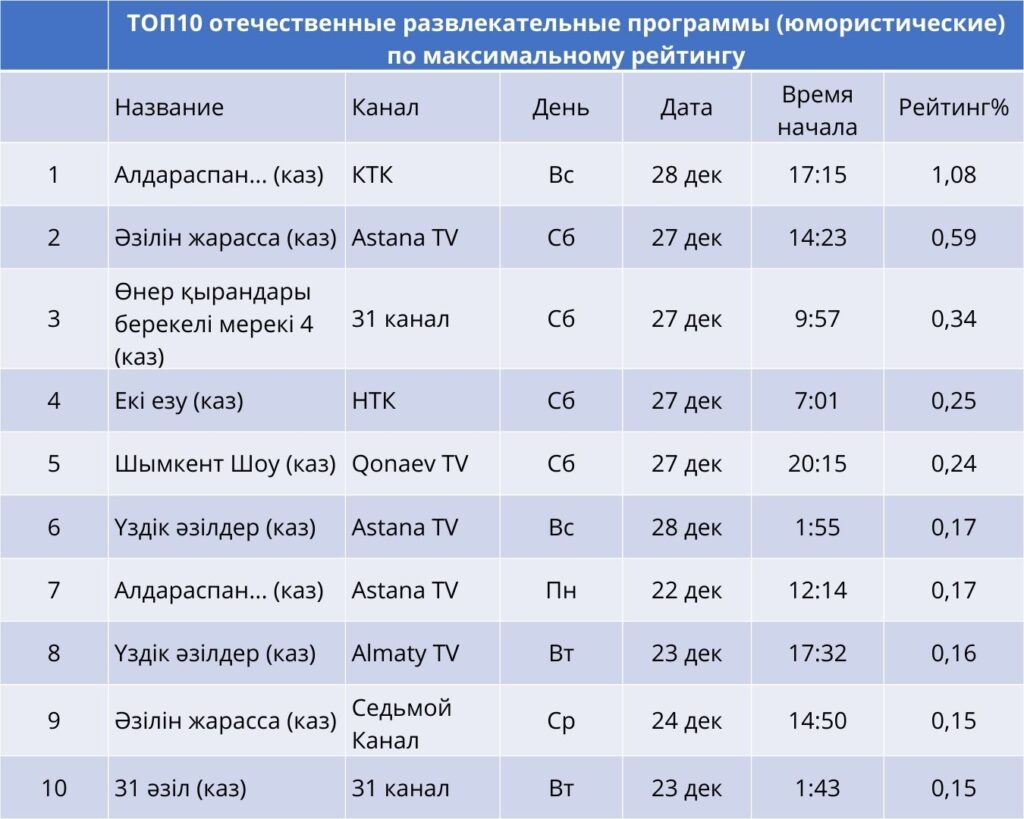 Әзіл жанры көрермен назарын тұрақты түрде ұстап келеді. Бірінші орында – КТК арнасындағы аңызға айналған «Алдараспан» (1,08%). Одан кейін Astana TV арнасындағы «Әзілін жарасса» (0,59%) және 31 арнадағы «Өнер қырандары» (0,34%).