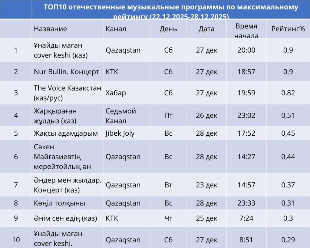 Музыкалық жобалар өз позициясын сенімді түрде сақтап келеді. Апта көшбасшысы – Qazaqstan арнасындағы «Ұнайды маған cover кеші» (0,90%). Одан кейін КТК арнасындағы Nur Bullin концерті (0,90%) және «Хабар» арнасындағы «The Voice Қазақстан» шоуы (0,82%). Музыкалық жобалар аудиторияны біріктіріп, кешкі эфирдің маңызды оқиғасына айналуда.