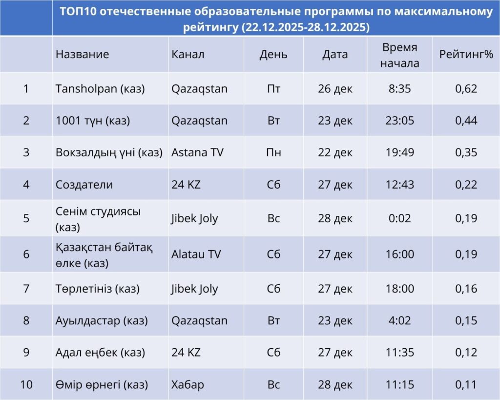 Бұл санатта Qazaqstan арнасындағы жұма күнгі «Таңшолпан» таңғы жобасы көш бастап тұр (0,62%). Одан кейін «1001 түн» (0,44%) және Astana TV арнасындағы «Вокзалдың үні» (0,35%). Білім беру бағдарламалары нишалық өнім болып қалғанымен, тұрақты аудиториясын сақтап отыр.