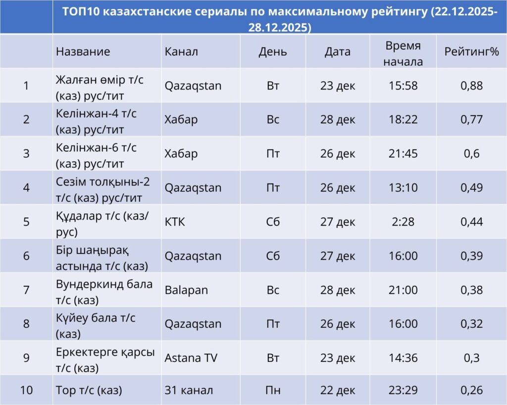 Бірінші орында – Qazaqstan арнасындағы «Жалған өмір» драмасы (0,88%). Екінші және үшінші орындарды «Хабар» арнасындағы «Келінжан-4» (0,77%) және «Келінжан-6» (0,77%) телехикаялары иеленді. Қазақстандық сериалдар шетелдік өнімдермен бәсекеге қабілетті болып, көрермен назарын ұстап тұр.