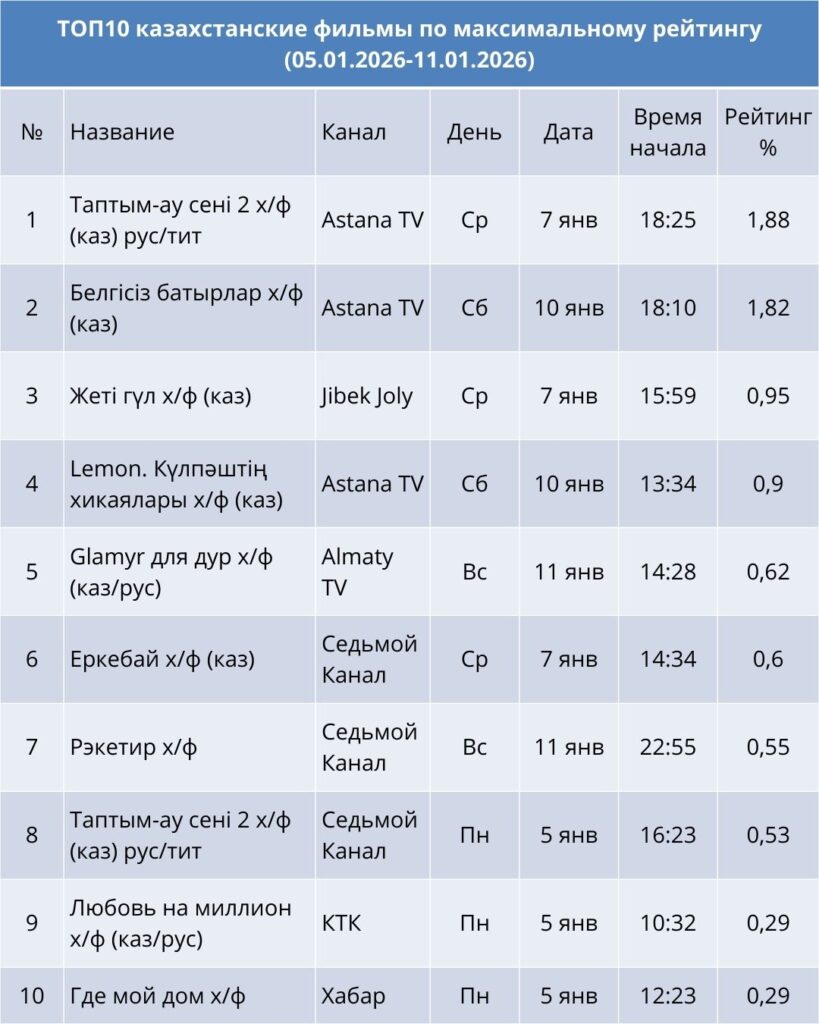 Astana TV занял первые два места: «Таптым-ау сені 2» (1,88%) и «Белгісіз батырлар» (1,82%). Топ‑3 закрывает Jibek Joly с „Жеті гүл“ (0,95%).
