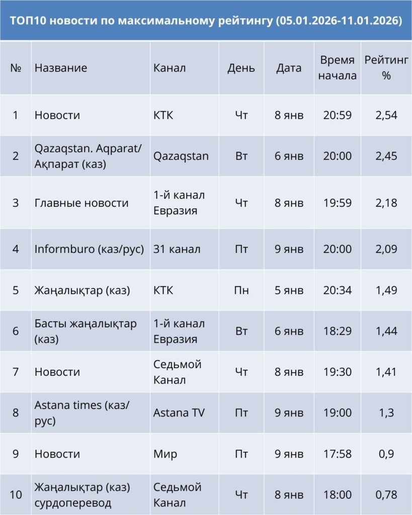 Лидером недели стали «Новости» на КТК — рейтинг 2,54%. На вторую строчку поднялся «Qazaqstan. Aqparat» (2,45%). Замыкают тройку «Главные новости» на Первом канале Евразия (2,18%). В целом зрители продолжают ориентироваться на проверенные источники информации, а крупные национальные каналы сохраняют высокий уровень доверия.