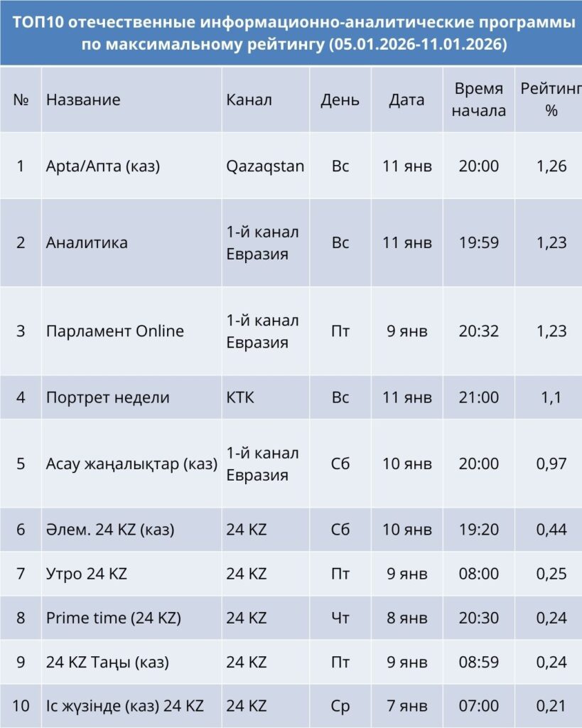 Здесь уверенно лидирует Qazaqstan с передачей «Апта» (1,26%). На втором и третьем местах постоянные участники топ-3 — «Аналитика» и «Парламент Online» на Первом канале Евразия (по ~1,23%). Интерес к аналитике остаётся стабильным: аудитория по-прежнему готова смотреть программы с более глубоким разбором событий и политической повестки.