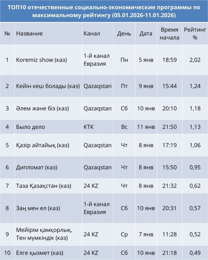 Первое место в категории сохраняет «Koremiz show» на Евразии (2,02%). На втором и третьем — «Кейін кеш болады» (1,24%) и «Әлем және біз» (1,18%) на Qazaqstan. Интерес к социальным и экономическим вопросам остаётся высоким, что отражает вовлечённость аудитории в актуальную общественную повестку.