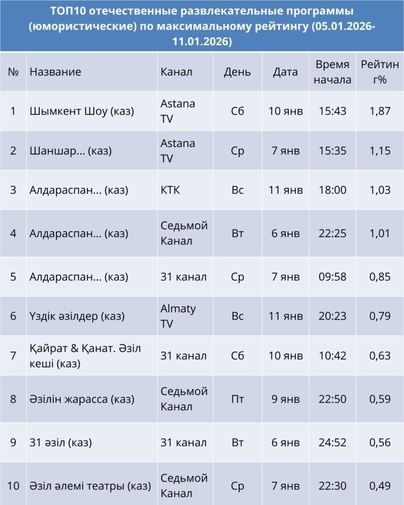 Лидрует телеканал Astana TV с «Шымкент Шоу» (1,87%) и Шаншар» (1,15%), а далее сразу три строчки занимает стабильный фаворит рейтинга «Алдараспан» на КТК, Седьмом и 31 канале.