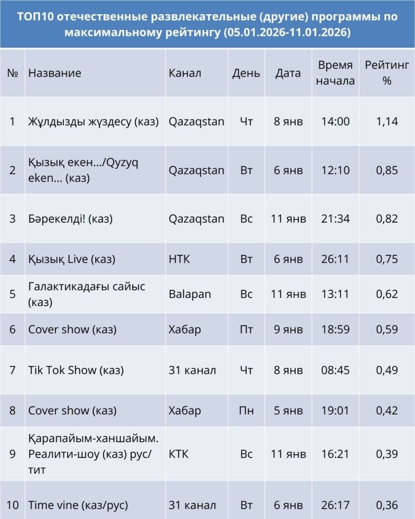 Тройка полностью принадлежит каналу Qazaqstan: «Жұлдызды жүздесу» (1,14%), «Қызық екен…» (0,85%) и «Бәрекелді!» (0,82%). Разговорные и развлекательные шоу стабильно удерживают внимание аудитории, подтверждая интерес к живому общению, гостям и неформальному контенту.