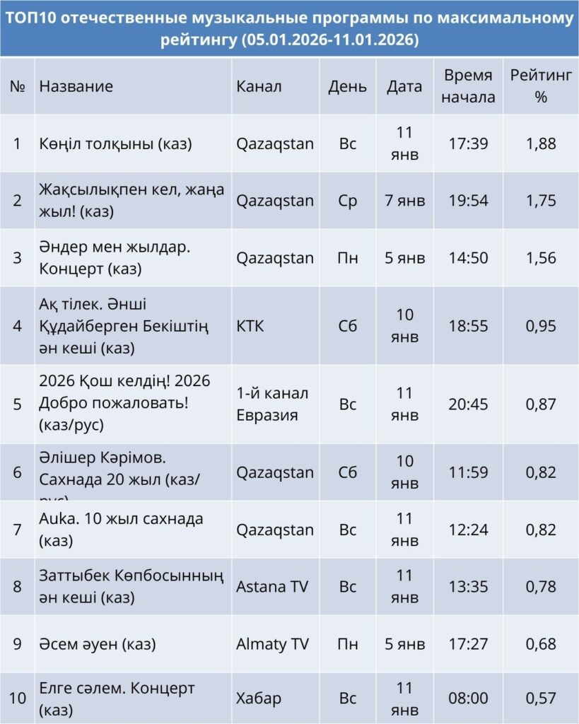 Музыкальный блок так же стал триумфом Qazaqstan: «Көңіл толқыны» (1,88%), «Жақсылықпен кел, жаңа жыл!» (1,75%) и «Әндер мен жылдар» (1,56%). В целом в категории канал занял половину строчек рейтинга. Музыка остаётся универсальным форматом, который одинаково хорошо работает на разную аудиторию и особенно востребован в праздничный период.