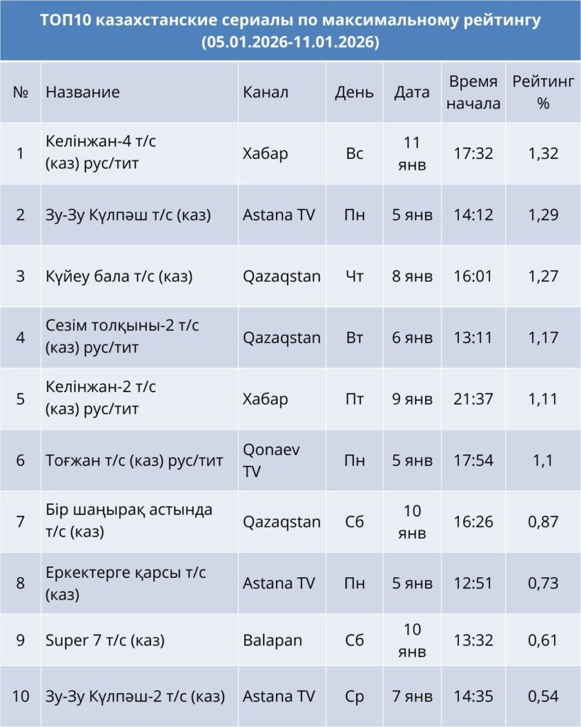 Лидирует «Келінжан-4» на Хабаре (1,32%). Далее «Зу-Зу Күлпәш» на Astana TV (1,29%) и «Күйеу бала» на Qazaqstan (1,27%). Отечественные истории остаются важным элементом эфира, а конкуренция между каналами в этом сегменте заметно усиливается.