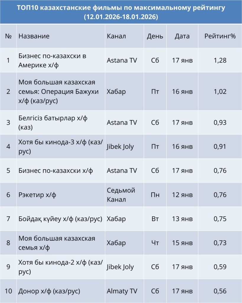 Среди отечественного кино наибольший интерес вызвал фильм «Бизнес по-казахски в Америке» на Astana TV — 1,28%. Второе место занял фильм «Моя большая казахская семья: Операция Бажухи» на Хабаре — 1,02%. Третью позицию удержал фильм «Белгісіз батырлар» на Astana TV -0,93%.