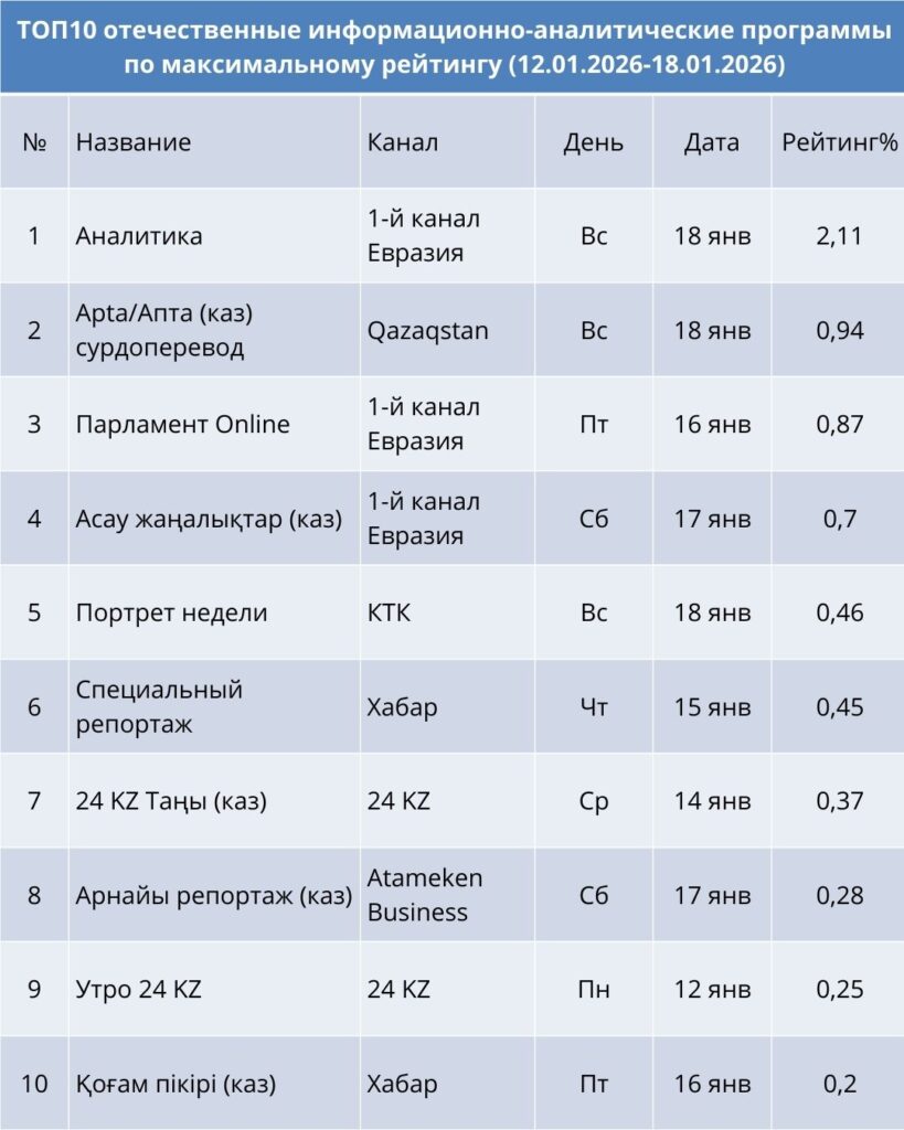 Лидером недели стали «Главные новости на Первом канале Евразия» — рейтинг 2,62%. На втором месте — «Жаңалықтар на Первом канале Евразия (каз)» (2,60%). Третью позицию занял «Qazaqstan. Aqparat / Ақпарат (каз)» (2,22%).