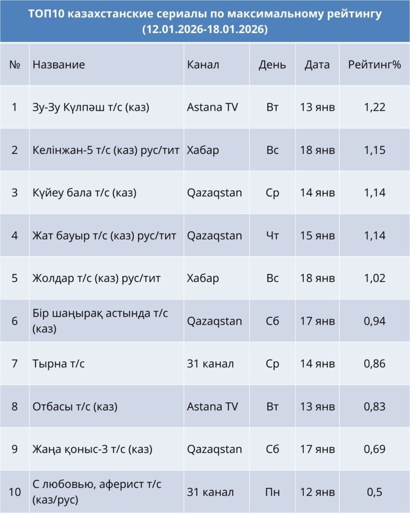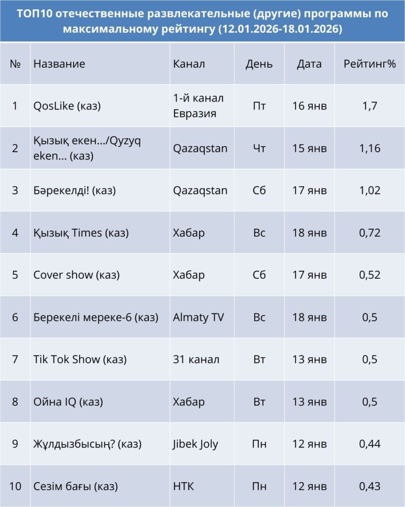 Неделя стала первой полноценной рабочей после новогодних праздников, что отразилось на структуре телесмотрения. Эфиры постепенно возвращались к стандартной сетке, а внимание аудитории смещалось от праздничного контента к регулярным форматам. По итогам недели тройка лидеров среди телеканалов выглядит следующим образом: Первый канал Евразия, Qazaqstan и 31 канал. Конкуренция между ними остаётся плотной, а перераспределение внимания зрителей — заметным.
