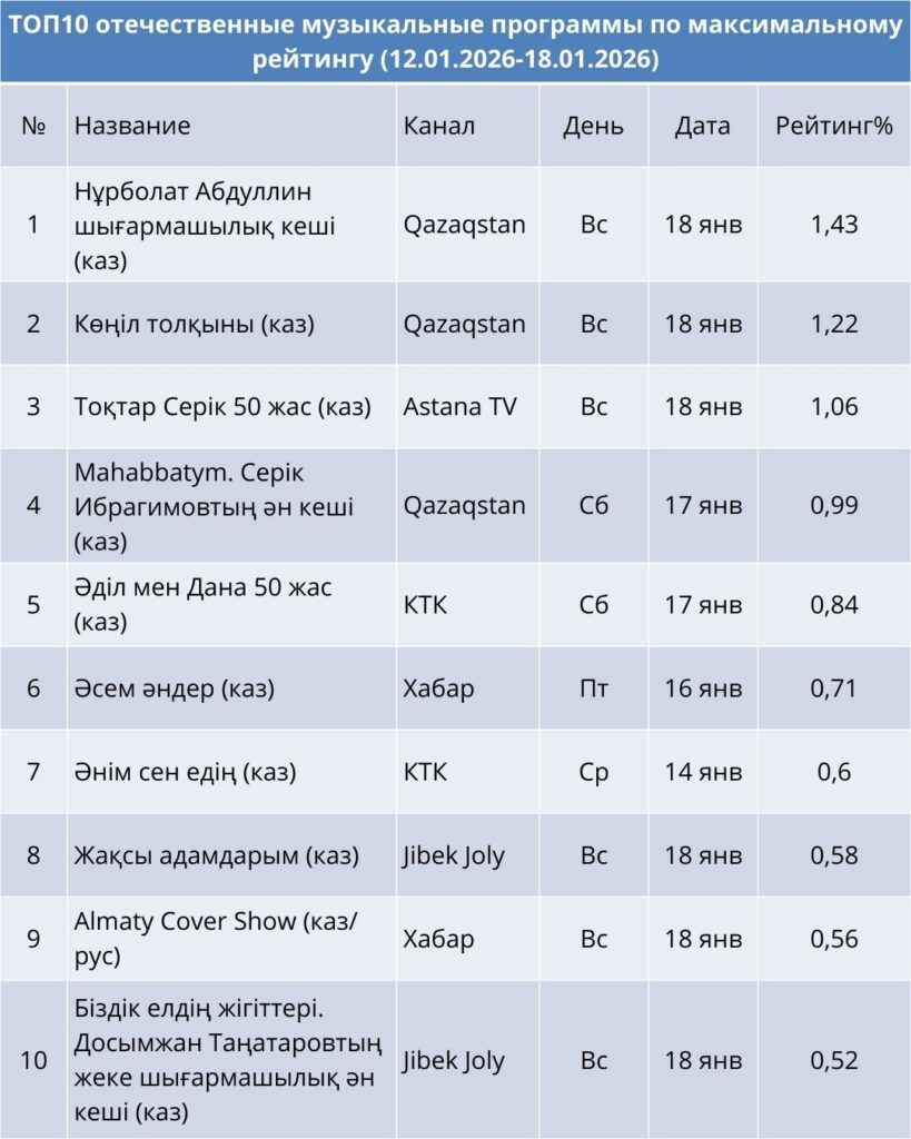 Музыкальные проекты сохраняют стабильный интерес аудитории. Половину строчек рейтинга заняли творческие и юбилейные вечера любимых артистов. Ну а лидером недели стала программа «Нұрболат Абдуллин шығармашылық кеші (каз)» на Qazaqstan с рейтингом 1,43%. Второе место у «Көңіл толқыны (каз)» на Qazaqstan (1,22%). Третью позицию заняла программа «Тоқтар Серік 50 жас (каз)» на Astana TV (1,06%).