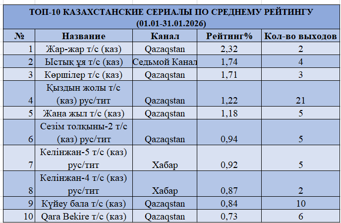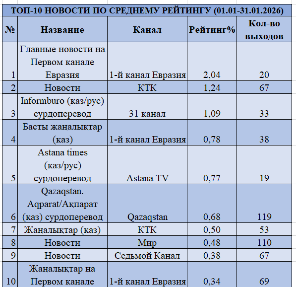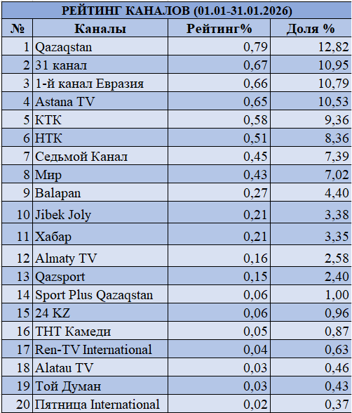 Ай қорытындысы бойынша көшбасшы Qazaqstan арнасы болды, рейтинг 0,79% және үлесі 12,82%. Екінші орында «31 арна» 0,67% және 10,95%, үшінші орында «Первый канал Евразия» 0,66% және 10,79%. Желтоқсанмен салыстырғанда алғашқы үштік өзгерді: мерекелік эфирлерге емес, тұрақты контентке сүйенетін арналар алға шықты. Astana TV төртінші орынға көтерілді 0,65% және 10,53%, ал КТК бесінші орында 0,58% және 9,36%.