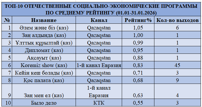 Қаңтар мерекеге толы желтоқсаннан кейін тұрақты эфирлік кестеге қайта оралу кезеңі болды. Егер 2025 жылдың соңында телесмотрениеге жаңа жылдық арнайы жобалар, концерттер және бір реттік эфирлер айтарлықтай әсер етсе, қаңтарда аудитория қайтадан тұрақты форматтарға — жаңалықтар, талдамалық бағдарламалар, әлеуметтік-саяси жобалар, сериалдар және күнделікті ойын-сауық шоуларына бет бұрды