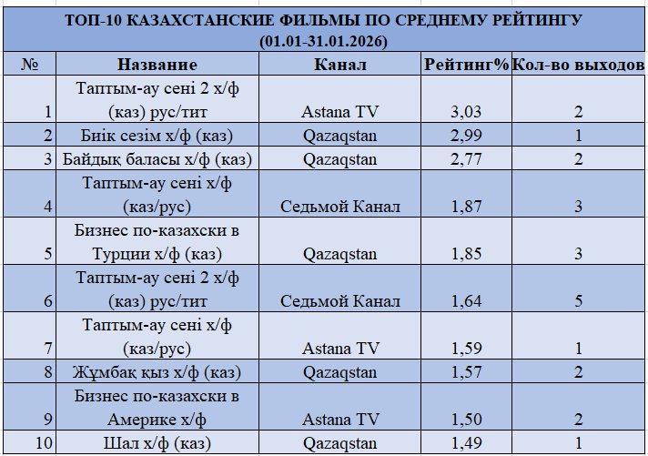 Қараша айымен салыстырғанда, кинопоказта «Биік сезім» және «Таптым-ау сені 2» сияқты фильмдердің күшті көрсеткіштері сақталды, қаңтар айы көрермендердің қазақстандық фильмдерге тұрақты қызығушылығын, әсіресе мерекелік және демалыс күндеріндегі көрсетілімдерде, растайды.