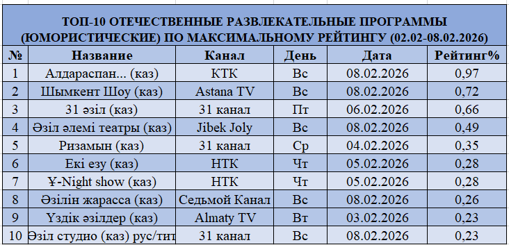 Ойын-сауық сегментінде әзіл-сықақ бағдарламалар арасында КТК арнасындағы «Алдараспан…» бірінші орынға шықты. Екінші орынды Astana TV арнасындағы «Шымкент Шоу», ал үшінші орынды 31 арнадағы «31 әзіл» иеленді. Бұл сегментте көшбасшылар құрылымында айтарлықтай өзгерістер байқалады.