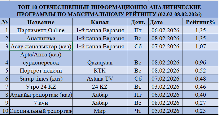 Ақпараттық-талдамалық бағдарламалар санатында айтарлықтай өзгерістер байқалмады. Көшбасшы орындарды «Еуразия бірінші арнасы» жобалары — «Парламент Online», «Аналитика» және «Асау жаңалықтар» иеленді.