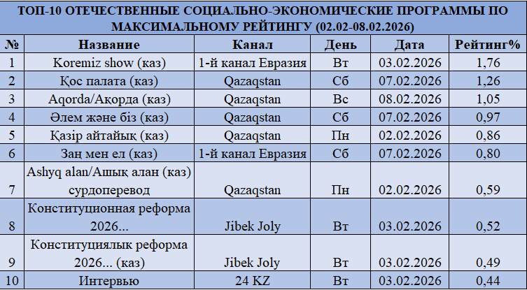 Әлеуметтік-экономикалық бағдарламалар санатында «Еуразия бірінші арнасы» арнасындағы «Koremiz show» көшбасшылықты сақтап қалды. Одан кейін Qazaqstan арнасындағы «Қос палата» және «Ақорда» бағдарламалары орналасып, өзекті күн тәртібі мен түсінікті форматтың арқасында көрермен назарын ұстап тұр.