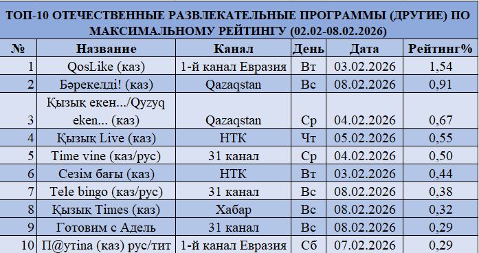 Басқа форматтағы ойын-сауық бағдарламалары арасында «Еуразия бірінші арнасы» арнасындағы QosLike бірінші орында тұр. Екінші орынды Qazaqstan арнасындағы «Бәрекелді!», ал үшінші орынды «Қызық екен… / Qyzyq eken» бағдарламасы сақтап қалды.