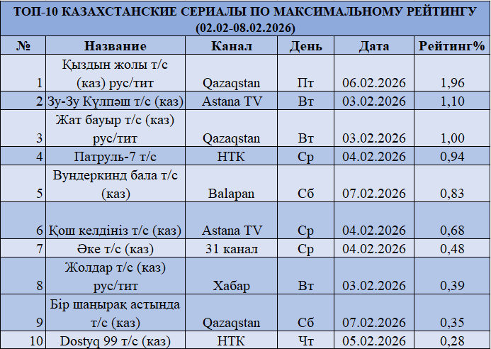 2026 жылғы 2–8 ақпан аралығындағы апта қорытындысы бойынша телесмотрение көшбасшысы 31 арна болды. Арна жаңалық контенті мен аудиторияны жоғары деңгейде тартатын ойын-сауық форматтарының үйлесімі есебінен бірінші орынға шықты. Екінші орында КТК, ал бұған дейін бірінші орында болған Qazaqstan үшінші орынға төмендеді.