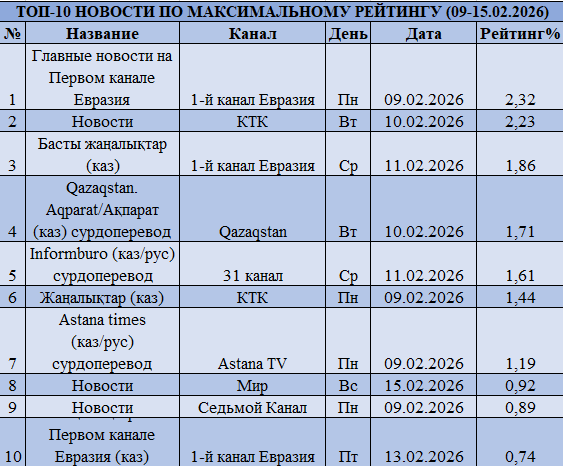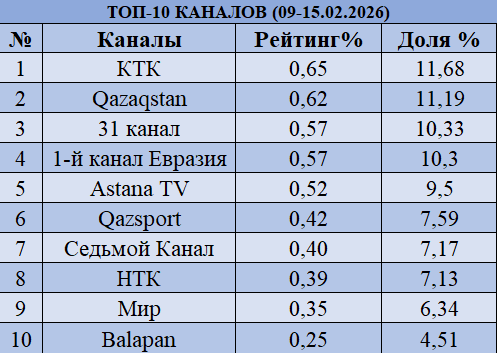 По итогам недели с 9 по 15 февраля 2026 года лидером телесмотрения стал КТК с рейтингом 0,65% и долей 11,68%, поднявшись на первое место за счет сильных позиций в новостном и развлекательном контенте. На втором месте расположился Qazaqstan с рейтингом 0,62% и долей 11,19%, улучшив позиции по сравнению с предыдущей неделей. 31 канал, который ранее занимал первую позицию, опустился на третье место с рейтингом 0,57% и долей 10,33%, разделив показатели с Первым каналом Евразия (рейтинг 0,57%, доля 10,3%).