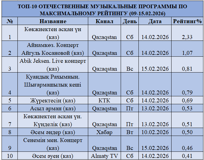 В музыкальном сегменте лидирующую позицию занимает программа «Көкжиектен асқан үн» на Qazaqstan с рейтингом 2,33%, значительно усилив показатели по сравнению с предыдущей неделей. На втором месте — «Айнаңкөз. Концерт Айгуль Косановой» (1,07%), на третьем — Abik Jeksen. Live концерт (0,81%), также на канале Qazaqstan, что свидетельствует о доминировании канала в музыкальном сегменте.