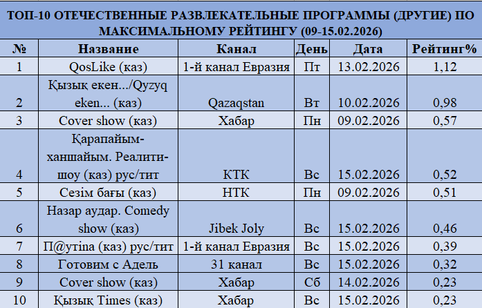 Среди развлекательных программ другого формата первое место занимает QosLike на Первом канале Евразия с рейтингом 1,12%, на втором месте — «Қызық екен… / Qyzyq eken» на Qazaqstan (0,98%), поднявшись с третьего места. А третью позицию занимает Cover show на Хабаре (0,57%).