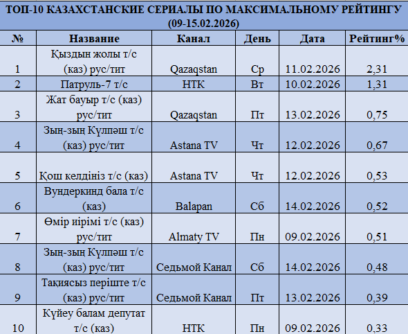 В сериальном сегменте в тройку лидеров вошли «Қыздың жолы» на Qazaqstan (2,31%), усилив позиции, «Патруль-7» на НТК (1,31%) и «Жат бауыр» на Qazaqstan (0,75%), что подтверждает стабильный интерес аудитории к отечественным сериалам.