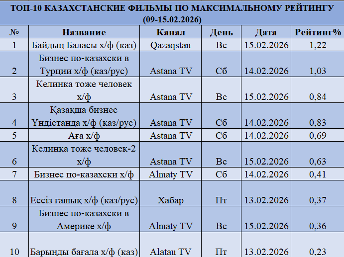 В категории фильмов в тройку лидеров вошли «Байдың баласы» на Qazaqstan (1,22%), «Бизнес по-казахски в Турции» (1,03%) и «Келинка тоже человек» на Astana TV (0,84%), что показывает рост интереса к кинопоказу в выходные дни.