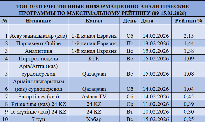 В категории информационно-аналитических программ произошли заметные изменения. Лидером стала программа «Асау жаңалықтар» на Первом канале Евразия с рейтингом 2,15%, значительно усилив показатели. Далее следуют «Парламент Online» (1,44%) и «Аналитика» (1,38%) на том же канале, что подтверждает доминирование Первого канала Евразия в сегменте.