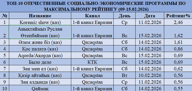 В категории социально-экономических программ произошли заметные изменения. Лидером остается «Koremiz show» на Первом канале Евразия с рейтингом 2,46%, значительно усилив позиции по сравнению с предыдущей неделей. Далее следуют премьера программы «Анықтаймыз Руслан Өтепбаевпен» (1,62%) на Первом канале Евразия и «Әлем және біз» (1,61%) на канале Qazaqstan.