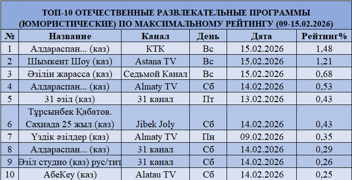 В развлекательном сегменте среди юмористических программ лидером остается «Алдараспан…» на КТК с рейтингом 1,48%, усилив позиции. На втором месте — стабильно «Шымкент Шоу» на Astana TV (1,21%), на третьем — «Әзілін жарасса» на Седьмом канале (0,68%). Сегмент сохраняет устойчивую структуру с усилением лидеров.