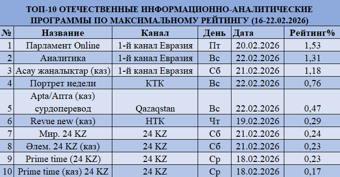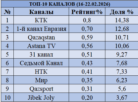 По итогам недели с 16 по 22 февраля 2026 года лидером телесмотрения остается КТК с рейтингом 0,8% и долей 14,38%, значительно усилив позиции по сравнению с предыдущей неделей. На втором месте закрепился Первый канал Евразия с рейтингом 0,70% и долей 12,68%, поднявшись с четвертой позиции и усилив конкуренцию в новостном сегменте. Qazaqstan опустился на третье место с рейтингом 0,59% и долей 10,71%, продолжив снижение после прошлой недели. 31 канал также потерял позиции и переместился на пятое место с рейтингом 0,51% и долей 9,27%, уступив Astana TV, который поднялся на четвертую позицию (0,56%, доля 10,06%).