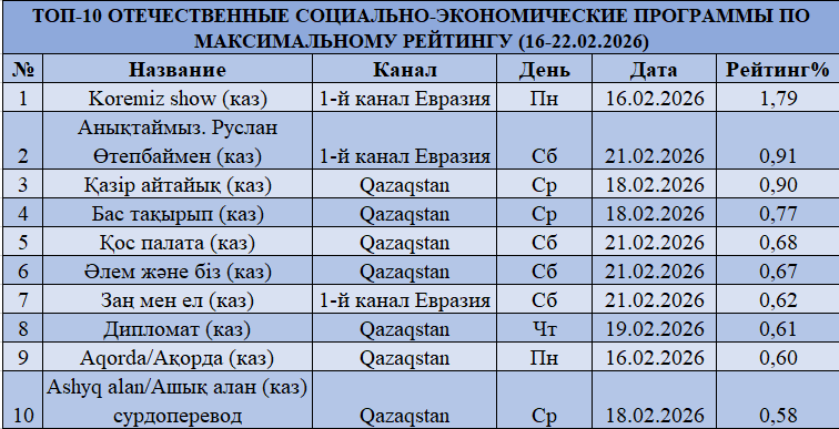 В категории социально-экономических программ лидером остается «Koremiz show» на Первом канале Евразия с рейтингом 1,79%, при этом показатель снизился по сравнению с прошлой неделей (2,46%). Далее следуют «Анықтаймыз. Руслан Өтепбаевпен» (0,91%) на Первом канале Евразия и программы Qazaqstan, включая «Қазір айтайық» (0,90%) и «Бас тақырып» (0,77%). Сегмент демонстрирует снижение пиковых значений при сохранении структуры лидеров.