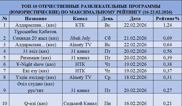 В развлекательном сегменте среди юмористических программ лидером остается «Алдараспан…» на КТК с рейтингом 1,24%, несмотря на небольшое снижение по сравнению с предыдущей неделей. На втором месте — «Тұрсынбек Қабатов. Сахнада 20 жыл» на Jibek Joly (0,69%), что указывает на рост интереса к концертным форматам. Третью позицию занимает «Алдараспан…» на Almaty TV (0,64%). Сегмент демонстрирует обновление структуры за счет появления новых проектов.