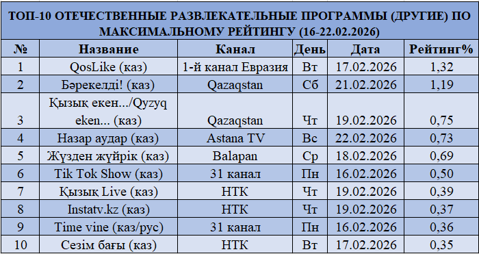 Среди развлекательных программ другого формата первое место сохраняет QosLike на Первом канале Евразия с рейтингом 1,32%, усилив показатели. На втором месте — «Бәрекелді!» на Qazaqstan (1,19%), также показав рост. Третью позицию занимает «Қызық екен… / Qyzyq eken» (0,75%), сохраняя стабильные позиции. Сегмент демонстрирует общий рост интереса аудитории.