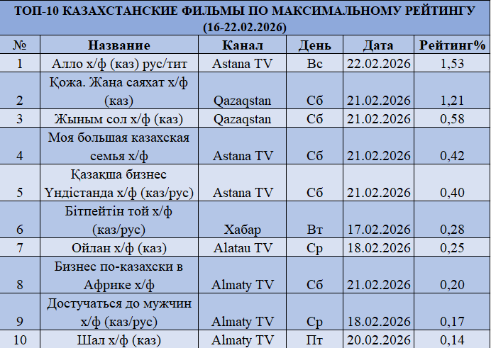 В категории фильмов лидером становится «Алло» на Astana TV с рейтингом 1,53%, что выше показателей прошлой недели. На втором месте — «Қожа. Жаңа саяхат» на Qazaqstan (1,21%), на третьем — «Жыным сол» на Qazaqstan (0,58%). В отличие от предыдущей недели, сегмент демонстрирует более выраженную роль Astana TV в кинопоказе.