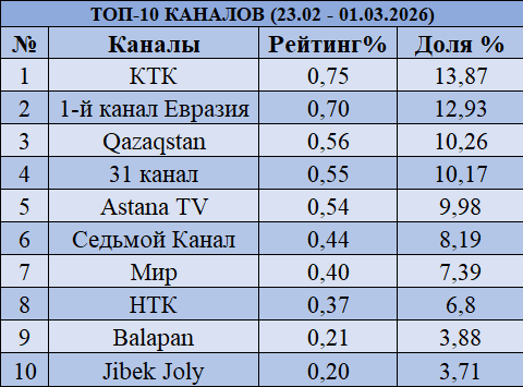 По итогам недели с 23 февраля по 1 марта 2026 года лидером телесмотрения остается КТК с рейтингом 0,75% и долей 13,87%, сохраняя первую позицию, несмотря на незначительное снижение показателей по сравнению с предыдущей неделей. На втором месте закрепился Первый канал Евразия с рейтингом 0,70% и долей 12,93%, продолжая усиливать позиции. Qazaqstan сохраняет третье место с рейтингом 0,56% и долей 10,26%, при этом показатели продолжают постепенно снижаться.