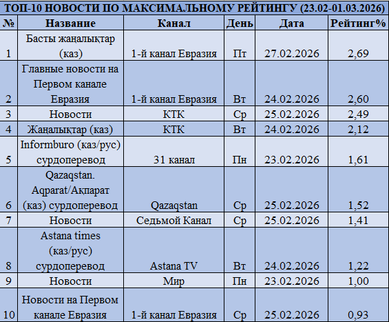 В новостном сегменте лидером недели становится «Басты жаңалықтар» на Первом канале Евразия с рейтингом 2,69%. На втором месте — «Главные новости» (2,60%) на том же канале, а третью позицию занимает «Новости» на КТК с рейтингом 2,49%.
