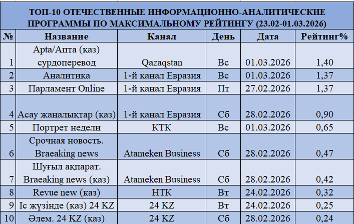 В категории информационно-аналитических программ произошли заметные изменения. Лидером становится «Апта» на Qazaqstan с рейтингом 1,40%, вернувшись на первую позицию. Далее следуют «Аналитика» (1,37%) и «Парламент Online» (1,37%) на Первом канале Евразия.