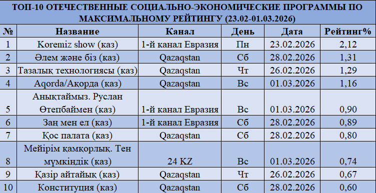 В категории социально-экономических программ лидером остается «Koremiz show» на Первом канале Евразия с рейтингом 2,12%. На втором месте — «Әлем және біз» на Qazaqstan (1,31%), на третьем — «Тазалық технологиясы» (1,29%). Далее следует «Ақорда» (1,16%), что показывает усиление позиций Qazaqstan в сегменте.