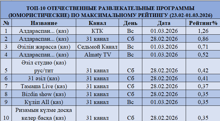 В развлекательном сегменте среди юмористических программ лидером остается «Алдараспан…» на КТК с рейтингом 1,26%, сохраняя устойчивые позиции. На втором месте — «Алдараспан…» на 31 канале (0,86%), на третьем — «Әзілін жарасса» на Седьмом канале (0,71%). Сегмент остается стабильным, при этом усиливается присутствие 31 канала за счет нескольких проектов в топе.
