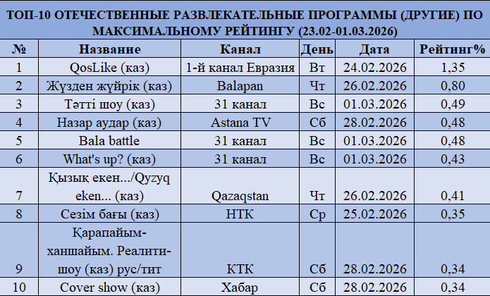 Среди развлекательных программ другого формата первое место сохраняет QosLike на Первом канале Евразия с рейтингом 1,35%, усилив позиции. На втором месте — «Жүзден жүйрік» на Balapan (0,80%), на третьем — Tatti шоу на 31 канале (0,49%). При этом в сегменте усиливается разнообразие каналов и форматов.
