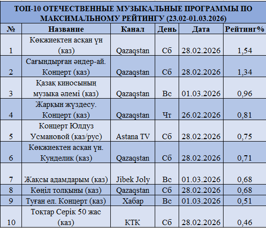 В музыкальном сегменте лидирующие позиции сохраняет Qazaqstan. Первое место занимает «Көкжиектен асқан үн» с рейтингом 1,54%, который на прошлой неделе занимал второе место. На втором месте — «Сағындырған әндер-ай. Концерт» (1,34%), на третьем — «Қазақ киносының музыка әлемі» (0,96%). Сегмент демонстрирует снижение пиковых значений при сохранении лидерства одного канала.