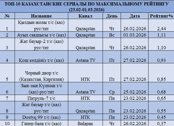 В сериальном сегменте лидером остается «Қыздың жолы» на Qazaqstan с рейтингом 2,44%, сохраняя высокие показатели. На втором месте — «Ауыл сақшысы» на Qazaqstan (1,11%), на третьем — «Жат бауыр» (1,10%), также на Qazaqstan, что подтверждает доминирование канала в сегменте.