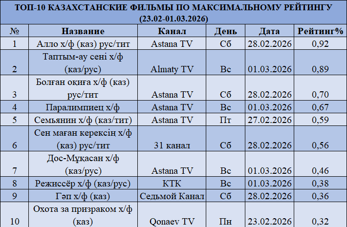В категории фильмов лидером становится «Алло» на Astana TV с рейтингом 0,92%, при этом показатель ниже по сравнению с предыдущей неделей. На втором месте — «Таптым-ау сені» на Almaty TV (0,89%), на третьем — «Болған оқиға» на Astana TV (0,70%). Сегмент демонстрирует снижение интереса по сравнению с предыдущей неделей и перераспределение позиций между каналами.