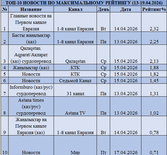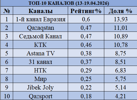 Арналардың жалпы рейтингінде айтарлықтай қайта бөлініс орын алды. Көшбасшылықты «Еуразия» Бірінші арнасы» сақтап қалды (0,6% және үлесі 13,93%), әрі өз позициясын нығайтты. Ал КТК төртінші орынға түсіп (0,46% және 10,78%), «Qazaqstan» (0,47% және 11,01%) мен «Жетінші арнаға» (0,47% және 10,89%) жол берді.