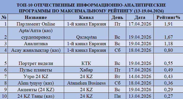 Ақпараттық-талдамалық бағыт тұрақты, бірақ салыстырмалы түрде баяу өсімді көрсетіп отыр. «Еуразия» Бірінші арнағы» «Парламент Online» (1,91%) көшбасшылықты сақтап, жаңалықтар деңгейіне жақындай түсті. «Qazaqstanдағы» «Апта» (1,67%) екінші орында, ал «Аналитика» (1,18%) үшінші орынға жайғасты.