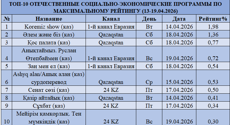 Әлеуметтік-экономикалық контент айтарлықтай күшейіп, екінші негізгі драйверге айналып келеді. «Koreimiz show» (1,98%) үздік жаңалықтар деңгейіне жақындап, маңызды сигнал берді. «Qazaqstan» «Әлем және біз» (1,36%), «Қос палата» (0,77%) жобалары арқылы мазмұнды топ қалыптастырса, «Еуразия» Бірінші арнасы» форматтар арқылы позициясын ұстап отыр.