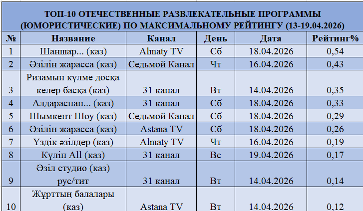Әзіл-сықақ сегментінде тоқырау байқалады. Ең жоғары көрсеткіш 0,54%-дан аспайды («Шаншар», Almaty TV), ал жобалардың басым бөлігі 0,4%-дан төмен деңгейде.